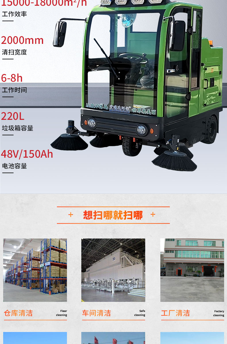 - 宏瑞達(dá)新能源電動(dòng)清掃車采用滾刷五聯(lián)動(dòng)式清掃,更大的增加了清掃效率和清掃潔凈度,清掃寬度可達(dá)2280mm,可以連續(xù)工作6-8小時(shí),特別適合煤礦、水泥廠、雕刻廠、面粉廠、建材廠、金屬冶煉廠、工廠車間、商場(chǎng)、車站、廣場(chǎng)公園、景區(qū)等場(chǎng)所使用。